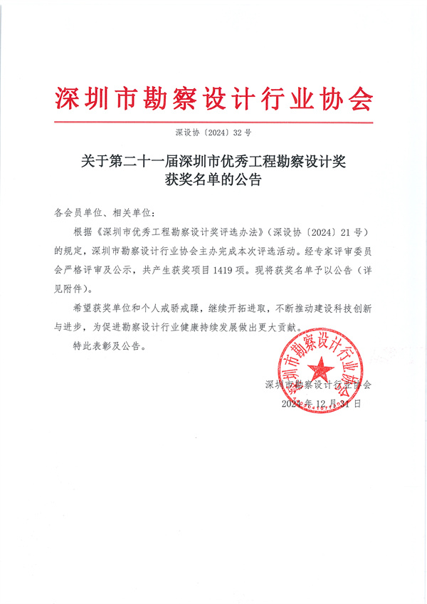深圳市優秀工程勘察設計獎是深圳市工程勘察設計領域設立的最高榮譽,旨在表彰和激勵在該領域做出杰出貢獻的個人和團隊。該獎項的頒發對于推動深圳市乃至全國勘察設計行業進步和技術創新具有重要意義。