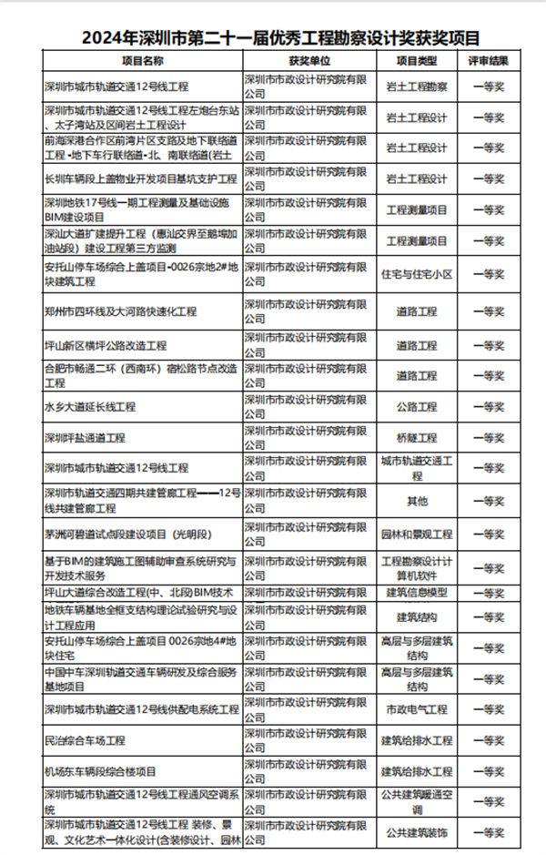 2024年深圳市第二十一屆優秀工程勘察設計獎評選結果正式揭曉。經過三輪嚴格的評審流程,公司共82個項目獲獎,包括一等獎25項、二等獎32項、三等獎25項。獎項覆蓋了工程勘察與巖土工程、住宅及住宅小區設計、市政公用工程設計等13個主要關鍵領域。