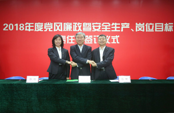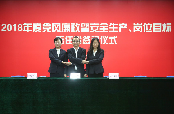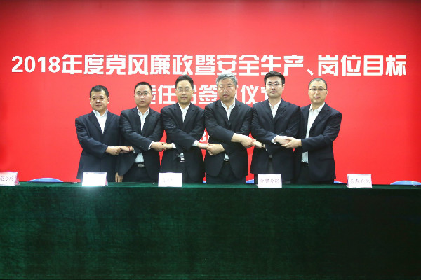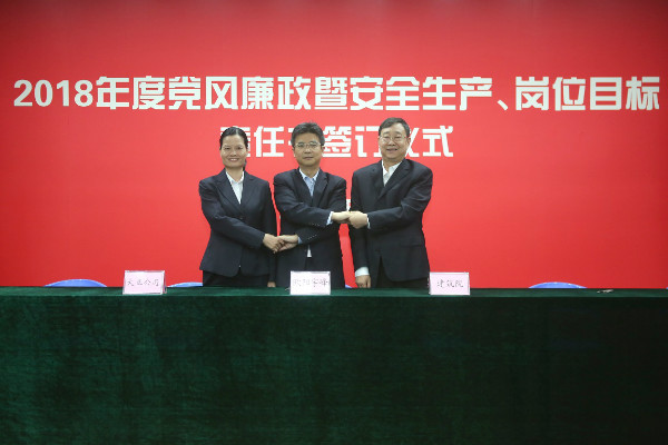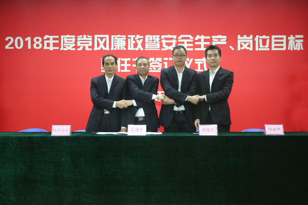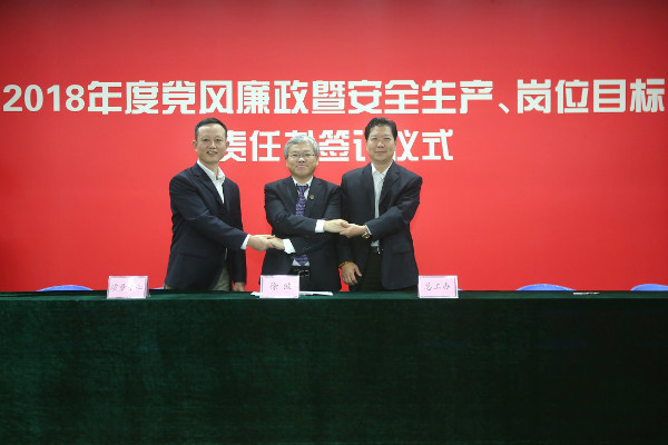 儀式開始,黨委書記、董事長陳宜言與黨委副書記、總經理蔡明和黨委副書記、紀委書記、工會主席郭明簽署了《2018年度崗位目標責任書》、《2018年度黨風廉政責任書》及《2018年度安全生產責任書》。黨委副書記、總經理蔡明與副總經理歐陽宇峰、副總經理王建新、副總經理張健君、副總經理許華林、總工程師徐波簽署責任書。緊接著,各分管領導與分管部門負責人簽署責任書。