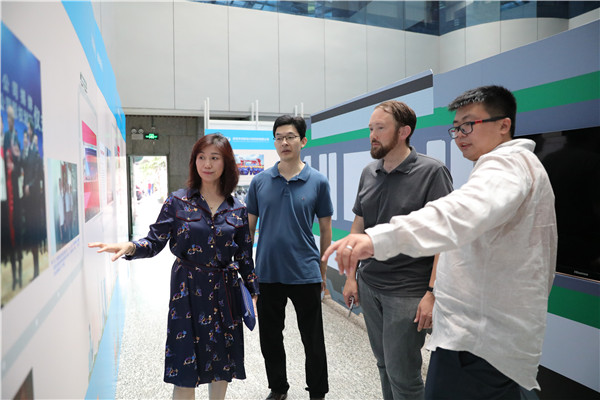 Stuart Buckenham一行在郭明的帶領(lǐng)下先后參觀了公司主樓大堂的“壯闊歲月 再尋初心”主題展、主樓六樓建筑規(guī)劃設(shè)計院,隨后前往主樓七樓學術(shù)活動室進行座談交流。