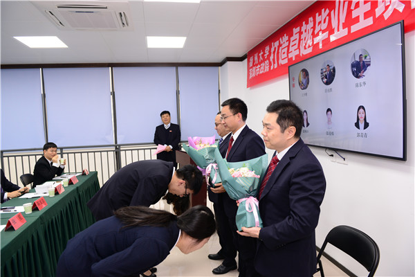 學生代表向陳宜言設計大師和張星副校長獻花。在領導們的見證下,學生們分別向各自的導師鞠躬行拜師禮。禮畢后,校企生代表上臺簽訂三方協議,我公司與福州大學完成學生交接。