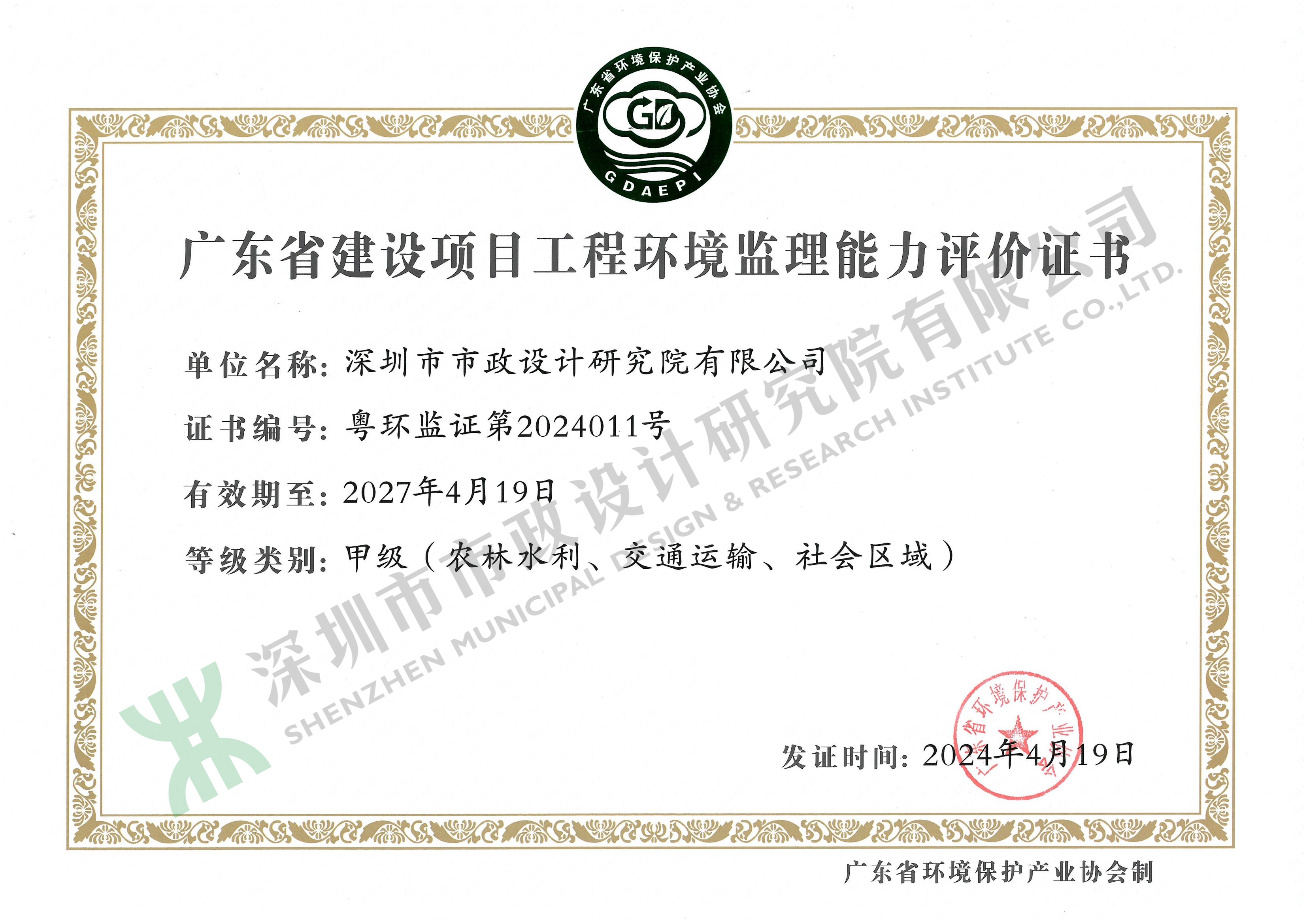 廣東省建設(shè)項(xiàng)目工程環(huán)境監(jiān)理能力評(píng)價(jià)證書(shū)